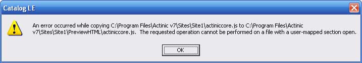 An error occurred while copy C:\Program Files\Actinic v7\Sites\Site1\actiniccore.js to C:\Program Files\Actinic v7\Sites\Site1\PreviewHTML\actiniccore.js. The requested operation cannot be performed on a file with a user-mapped section open.