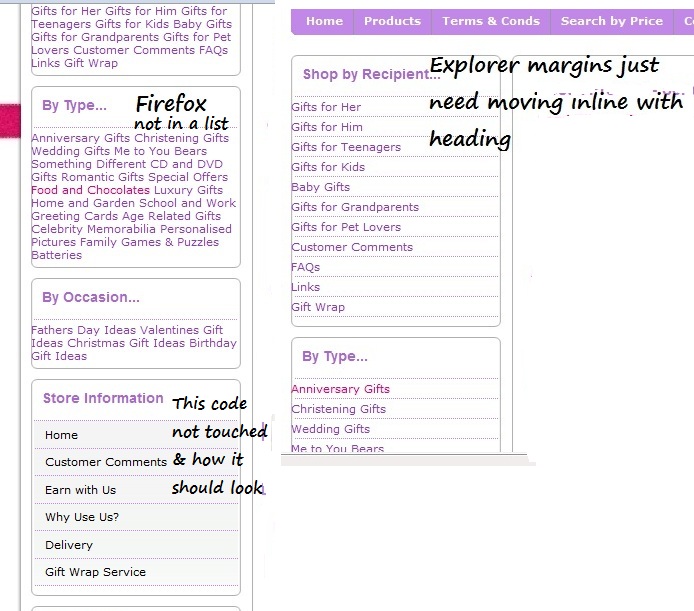 I am using Silver Theme in V10 and have followed the Aug p48 for splitting the section lists into different parts, but I lose all the styling and have managed to get some back, but not the margins. When viewing in IE8 it shows same as on my pc with no margins & too far to left, but on Firefox there is no layout at all and its all bunched up in a box. (See screenshot showing both versions.)
