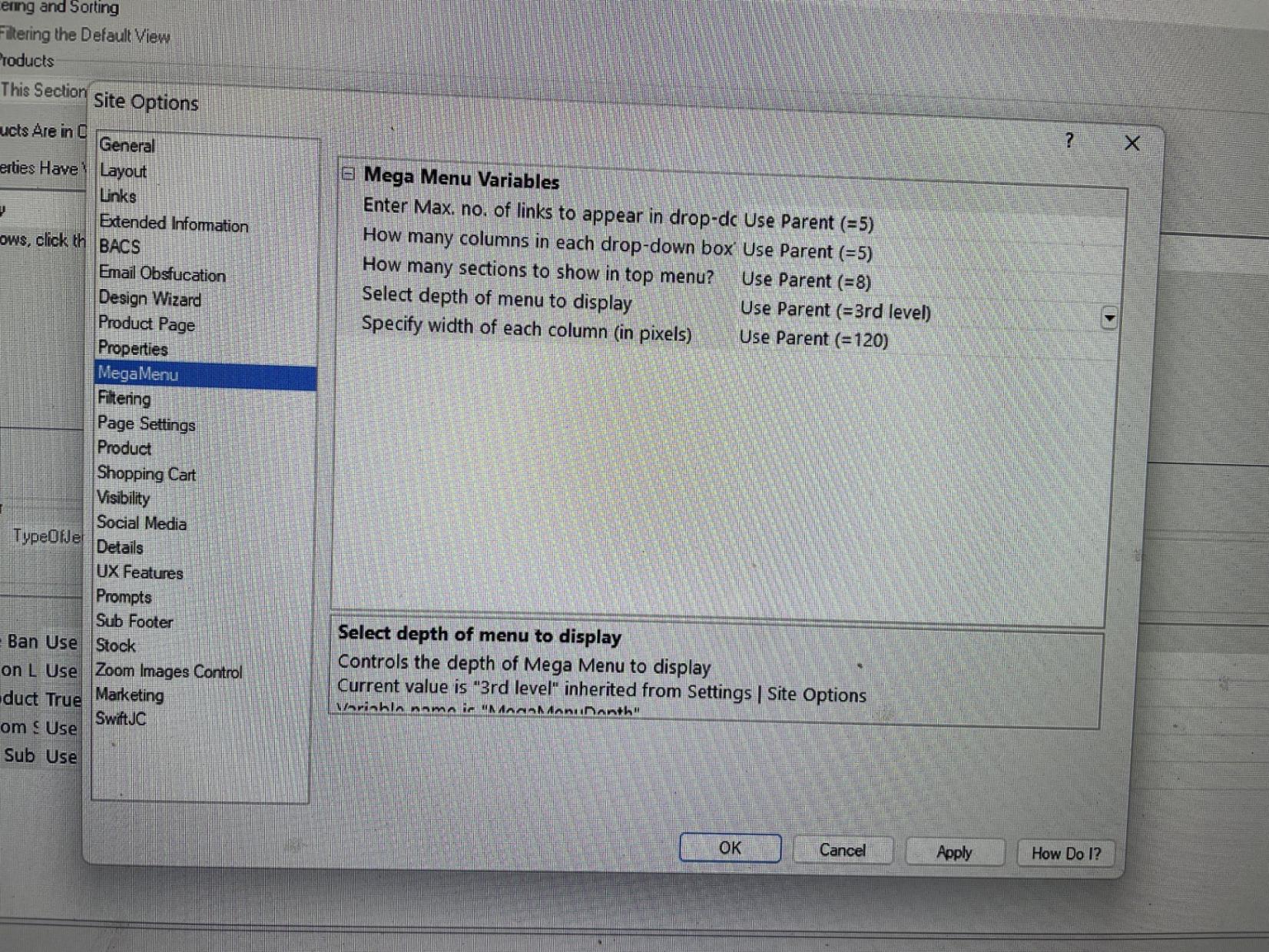 The Site Options | MegaMenu is configured to the default settings, I have tried changing the values, but nothing seems to change.