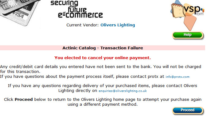 I've had almost no problems so far, but while running tests, I notice that the default cancellation page on the Sage server is an old Protx page including a Protx email. This doesn't look very professional, especially when I've tried my hardest to make Sage brand obvious through our small website.